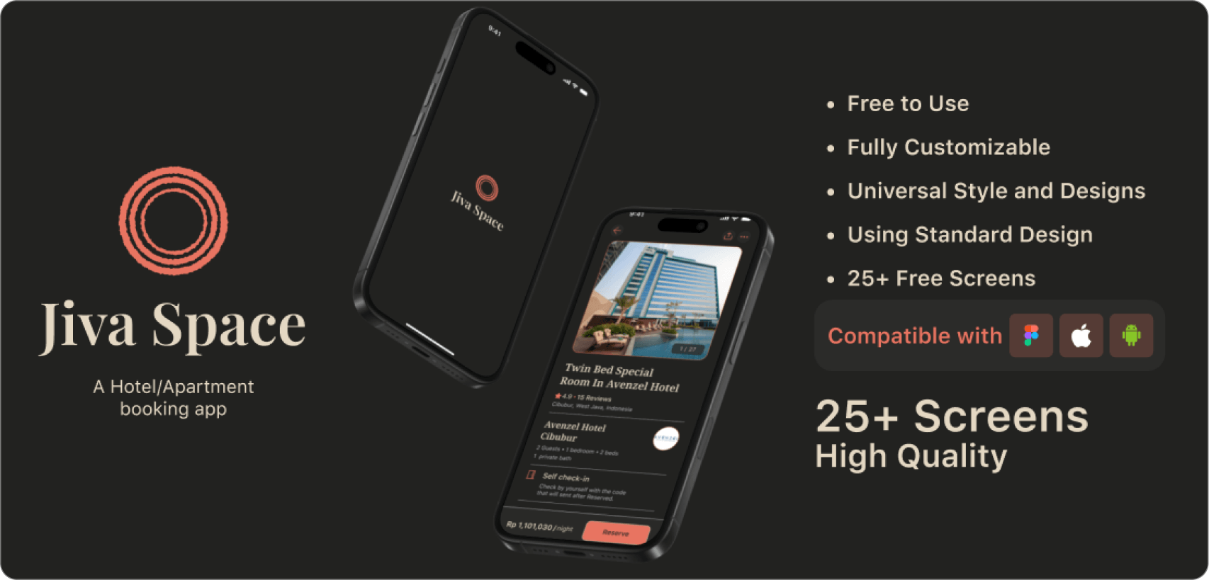 It's lovely to see a dark themed mobile app, and this set of 27 free Figma hotel booking app screen designs works perfectly in that theme. It's cool and strong whilst remaining calm and professional.